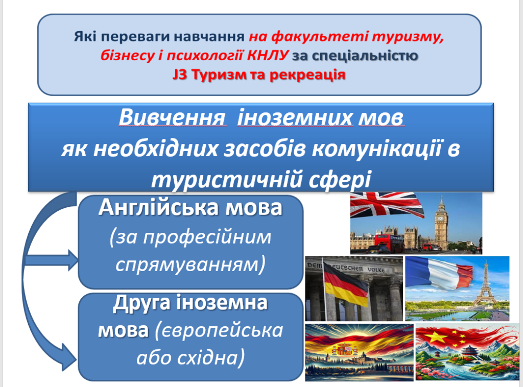 Навчання в нашому університеті за спеціальністю 242 Туризм і рекреація – це крута можливість отримати сучасну і затребувану професію. Ви будете вивчати дві іноземні мови, розвивати комунікаційні та аналітичні здібності, підготуєте міцний фундамент для свого фінансового благополуччя та продуктивної роботи на благо рідної країни.