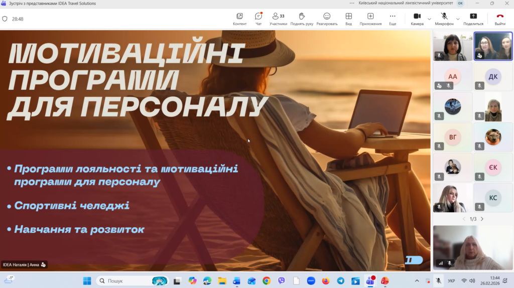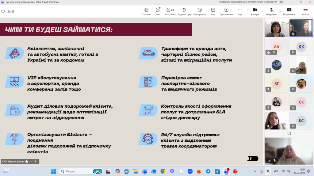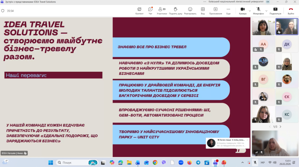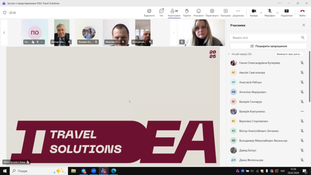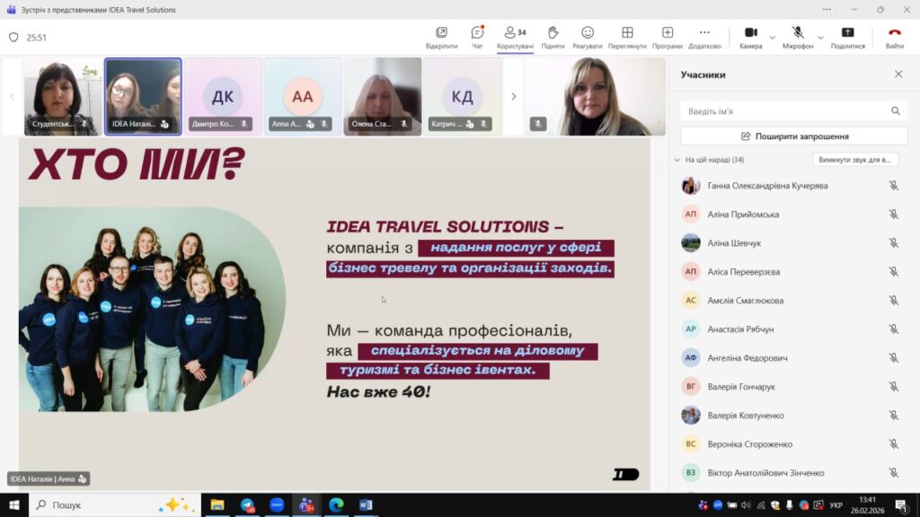 26 лютого 2026 р. відбулася зустріч студентів спеціальності Туризм та рекреація та викладачів кафедри історії і туризму з представниками компанії IDEA Travel Solutions, яка спеціалізується на організації ділового туризму та бізнес-івентах.
